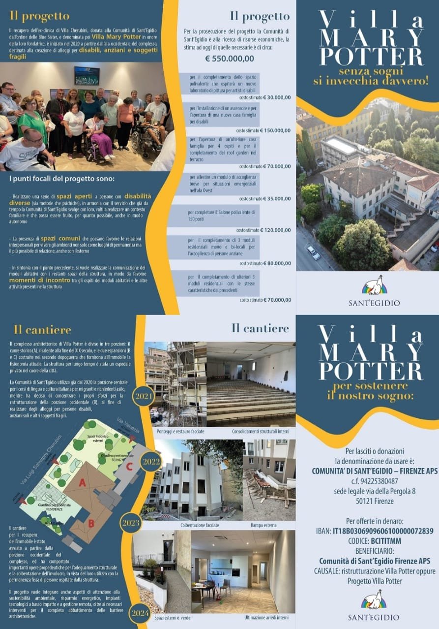 Villa Mary Potter is a current project of Sant’ Egidio. Money was given to help re-develop a large central building in Florence into accomodation for elderly disabled people